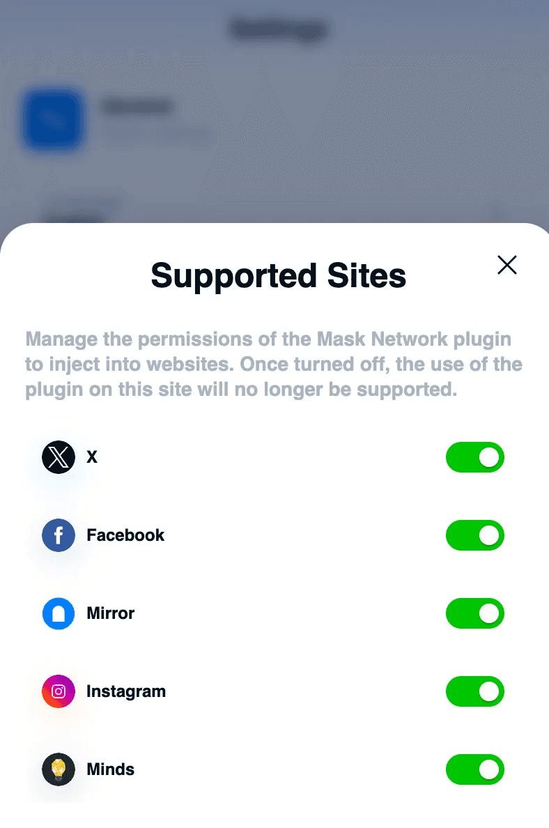 Set which websites the plugin can be applied to. Currently supported platforms: X, Facebook, Mirror, Instagram, Minds.