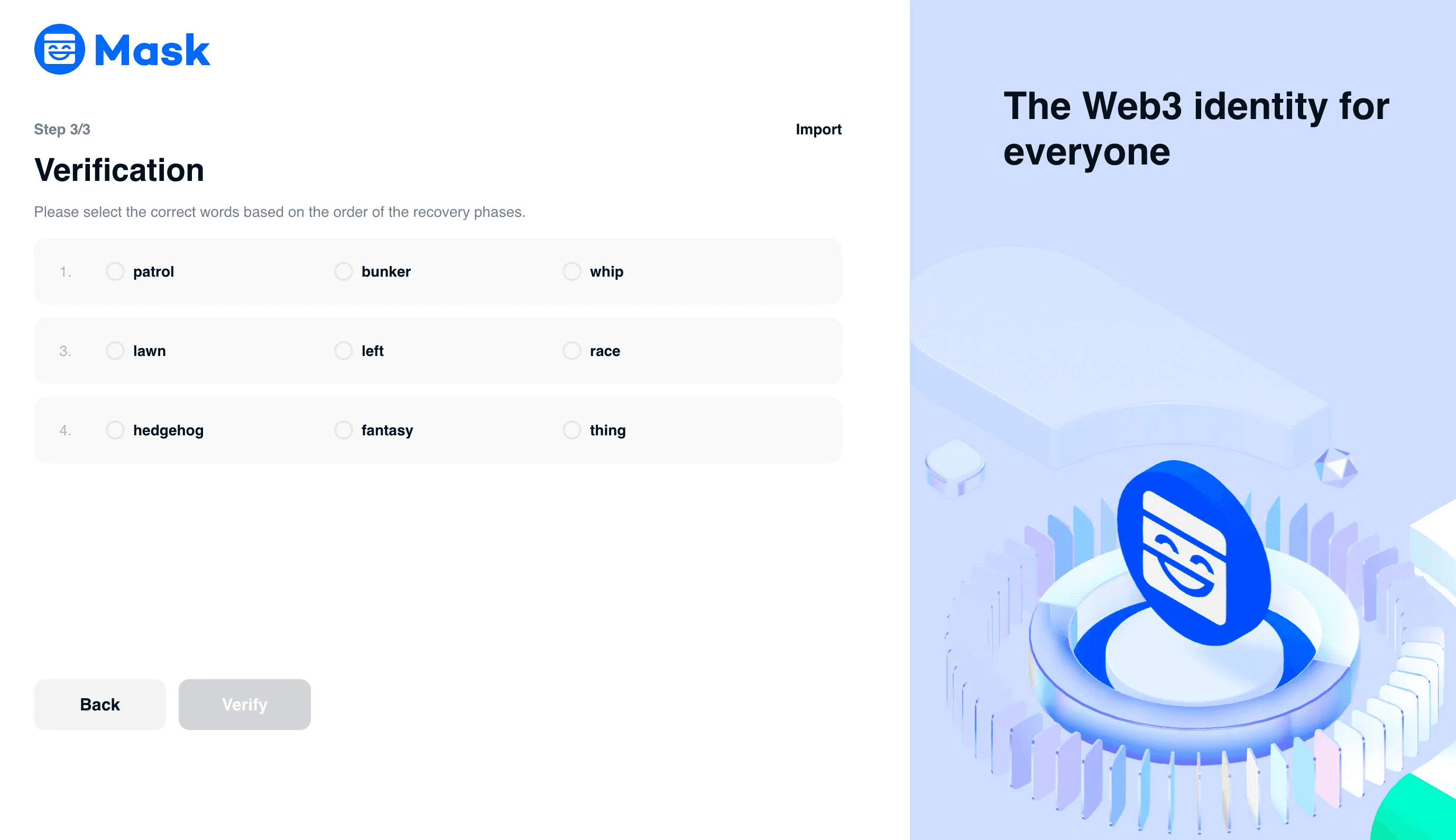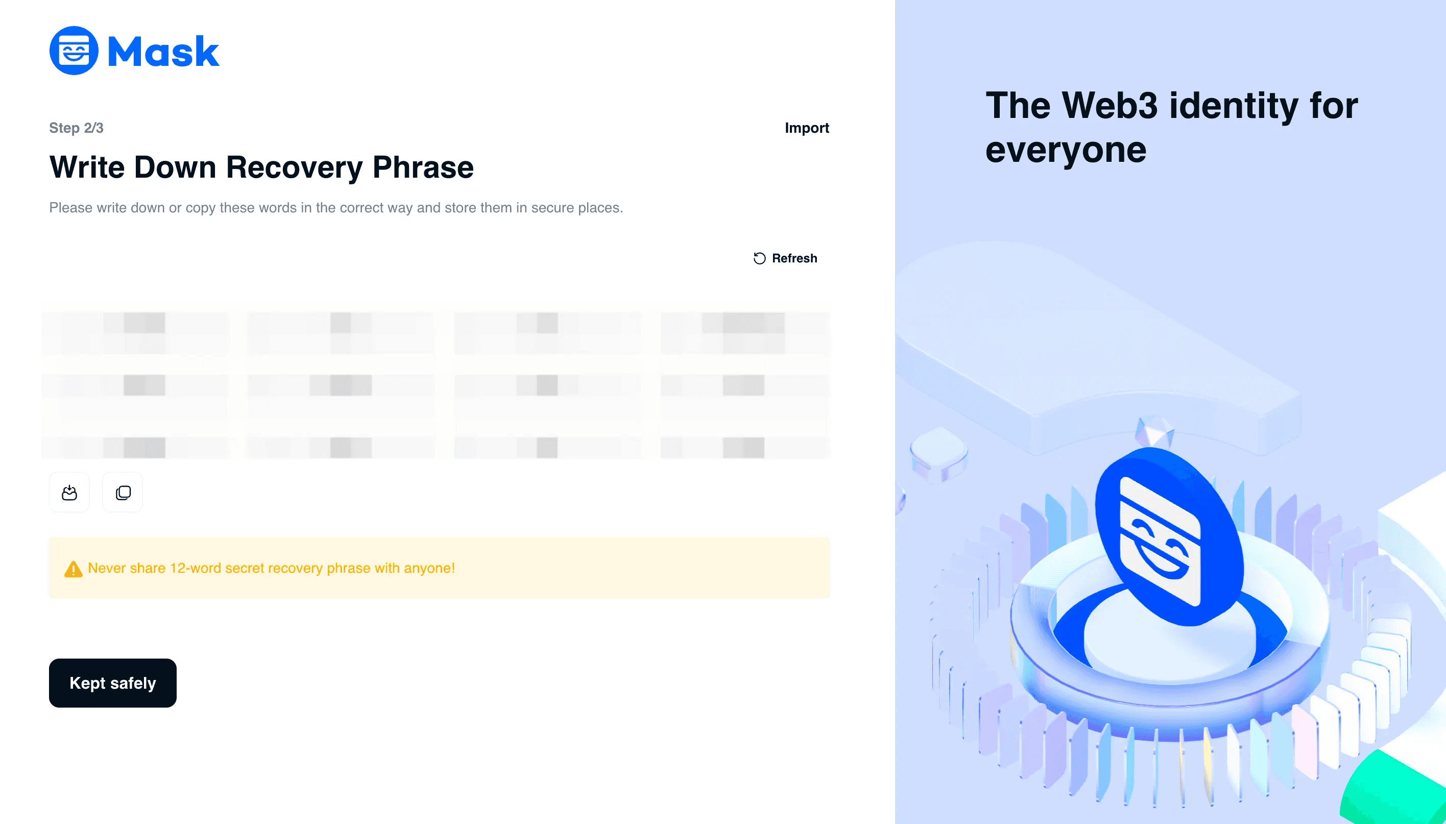Write down and memorise your recovery phrase on this page. Do not share them with anyone. This will be your only proof of ownership of your wallet assets. "Not your key, not your coin.”