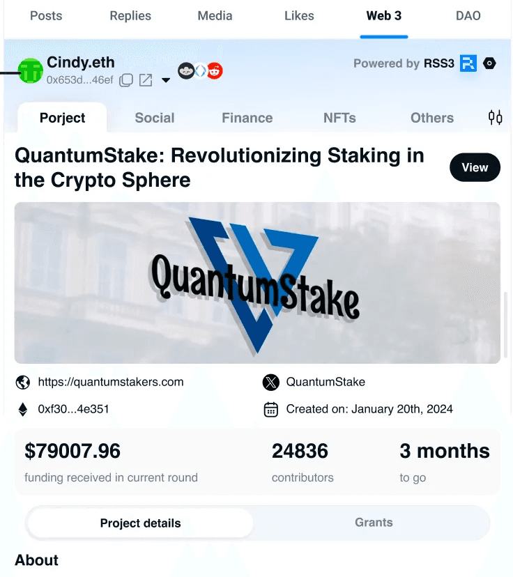 The Web3 Profile for individual users (Powered by RSS3) includes Social, Transaction Activities, Donation, NFTs, and Project sections.