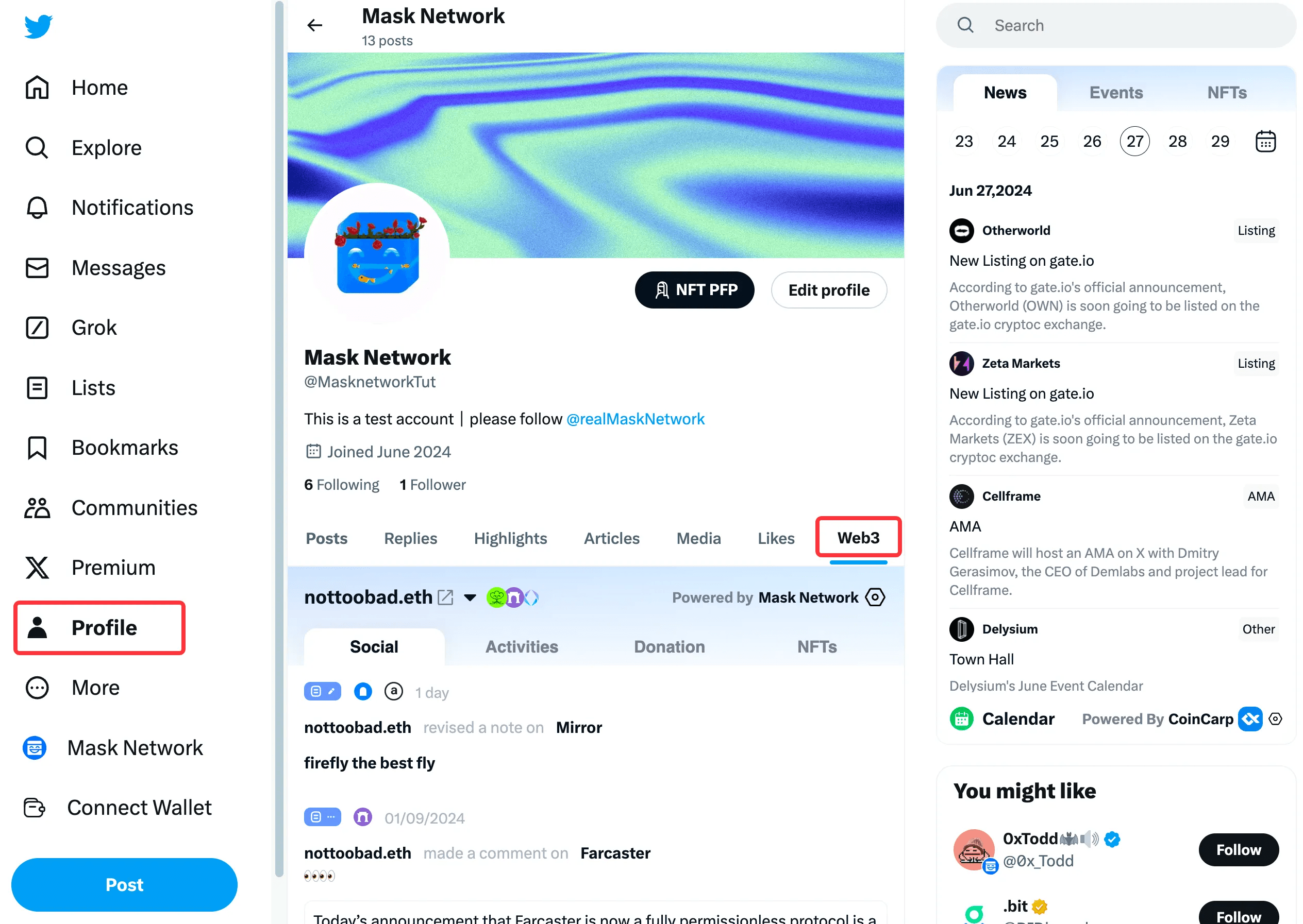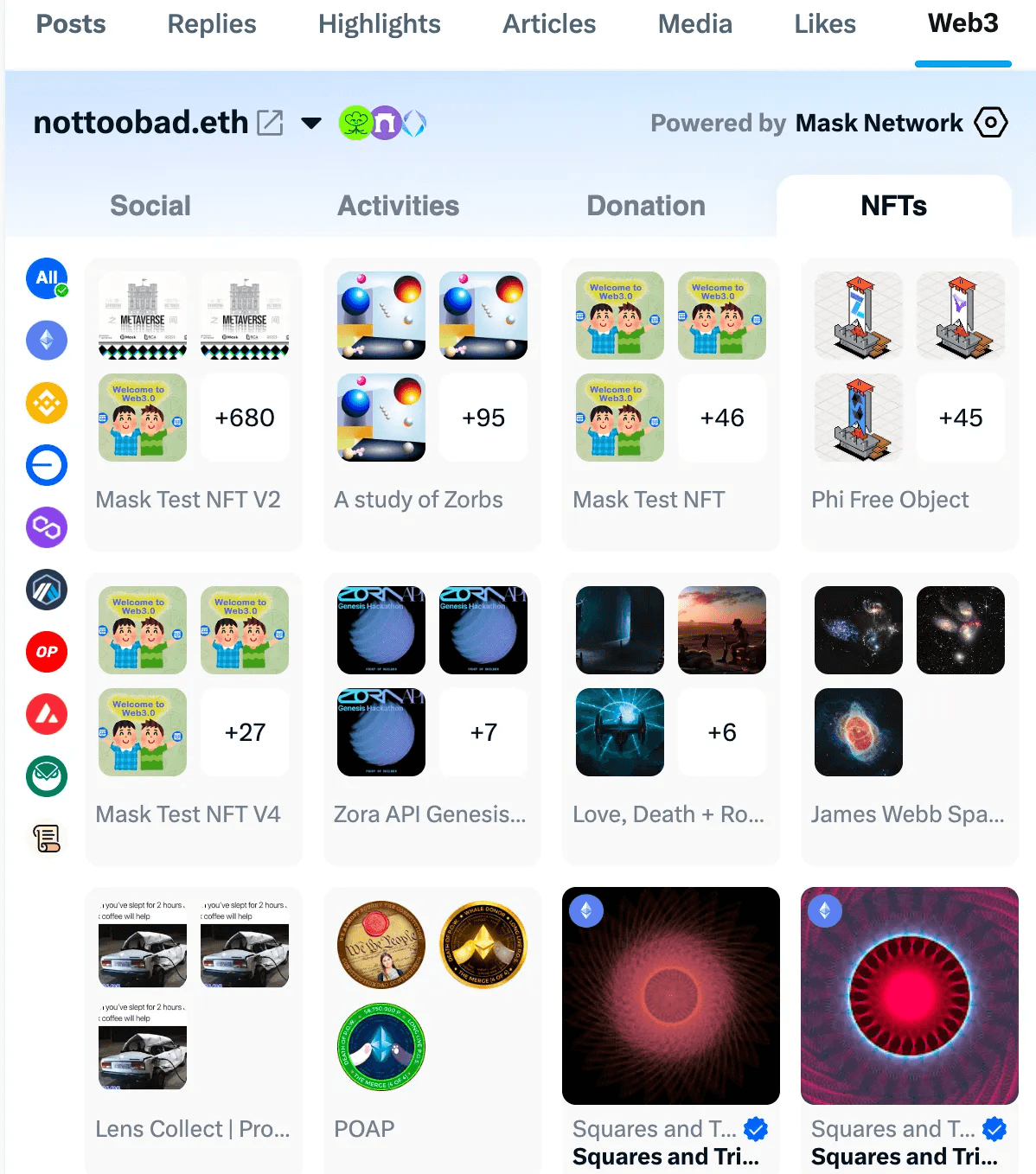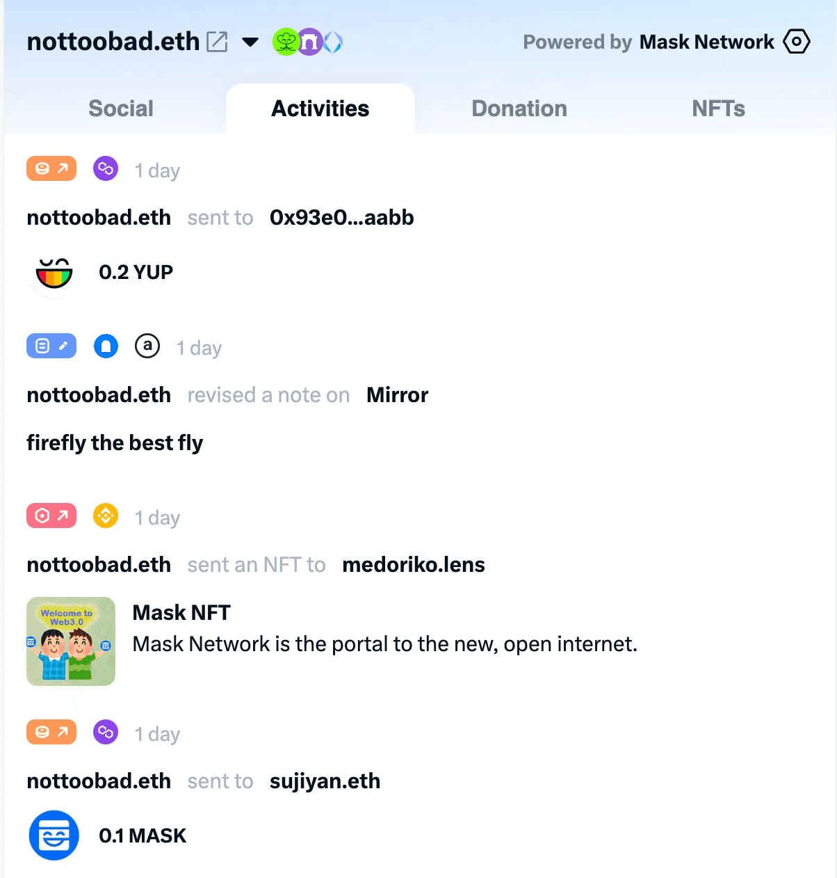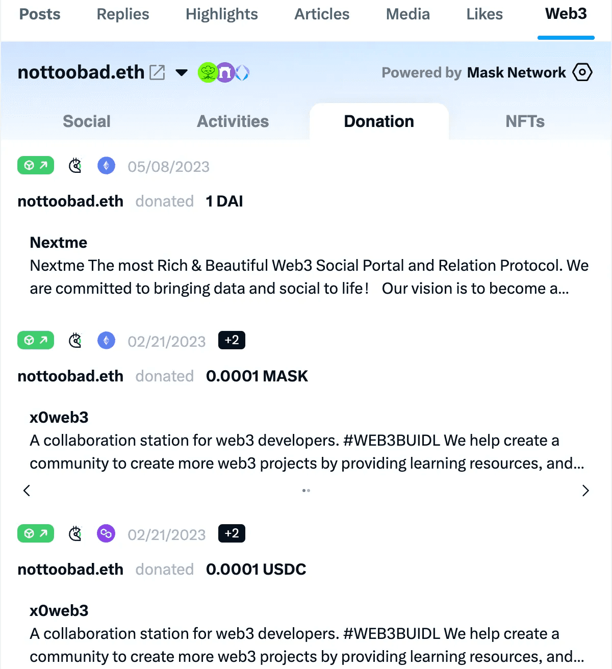 For users with Web3 data, you will see a Mask icon at the bottom right of their avatar. Hovering over this icon will bring up the Web3 Profile.