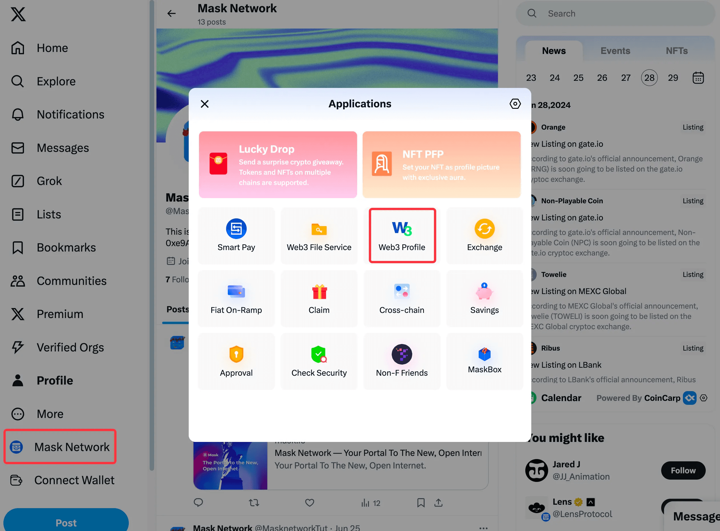 Click the Mask icon and select Web3 Profile in the Applications section.